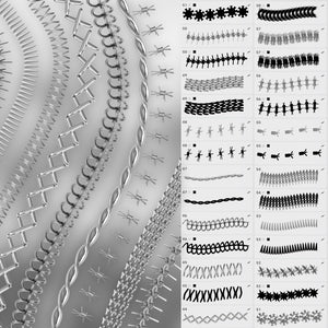 These barbed wire brushes for Procreate add tension and grit to your artwork. With sharp wires, thorns, and twisted cables, you can create edgy borders, fences, or symbolic motifs. The dual-color Procreate thorn brushes let you blend metallic and rust hues for realistic surfaces, making them ideal for apocalyptic scenes, tattoos, and graphic design.