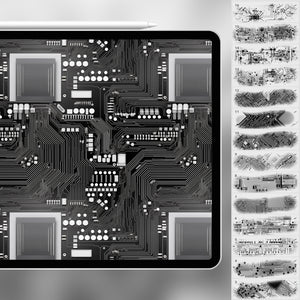 These Procreate circuit brushes emulate the intricate layouts of PCBs, microchips and digital grids. Use them to infuse your art with a cutting‑edge vibe, futuristic networks or a sense of electronic complexity.