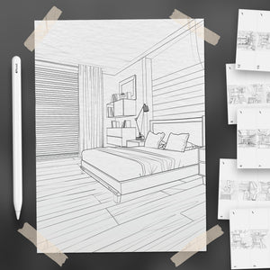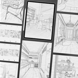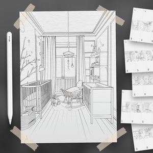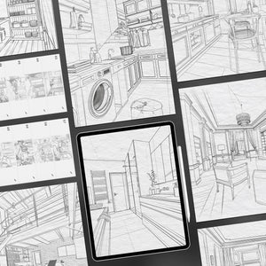 This Procreate background set is the ultimate tool for anyone who wants to add fully-furnished rooms like bedrooms, kitchens, living rooms, nurseries, and bathrooms directly into their artwork—no drawing needed.