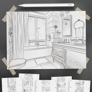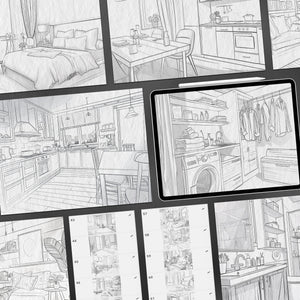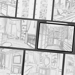 This Procreate background set is the ultimate tool for anyone who wants to add fully-furnished rooms like bedrooms, kitchens, living rooms, nurseries, and bathrooms directly into their artwork—no drawing needed.