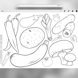 This Procreate stamp set is the ultimate tool for artists, illustrators, and designers who want to add food elements, farm-to-table details, or playful vegetable sketches to their projects.