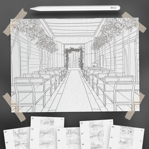 This Procreate background set is the ultimate tool for anyone who wants to craft beautiful ceremony scenes, elegant receptions, and enchanting gardens without sketching every aisle and arch.