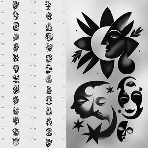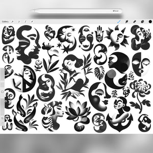 This Procreate stamp set is the ultimate tool for anyone who wants to design tattoo flash sheets, practice minimalistic tattoo style, or add abstract peace motifs to their artwork.