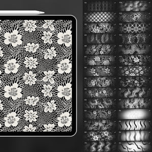 This Procreate texture set is the ultimate tool for anyone who wants to add intricate lace motifs, floral patterns and romantic details to their digital illustrations.
