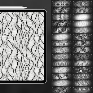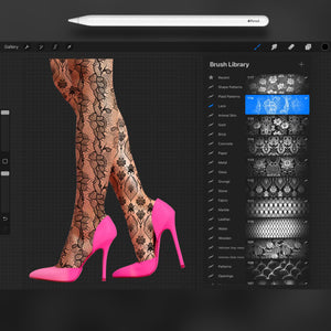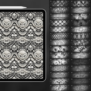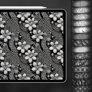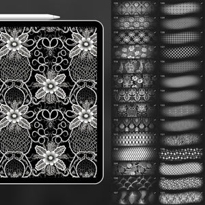These Procreate lace brushes bring airy, romantic lace patterns to your digital art. Whether you’re illustrating fashion pieces, designing invitations or crafting delicate backgrounds, these seamless textures respond beautifully to your creative vision. Perfect for artists seeking Procreate lace textures, floral lace brushes and delicate trim patterns.