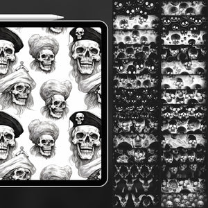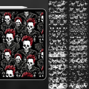 This Procreate pattern set is the ultimate tool for anyone who wants to add gothic vibes, pirate energy, or artistic skull motifs to their illustrations without spending hours creating repeating textures manually.