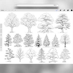 This Procreate stamp set is the ultimate tool for artists who want to design natural landscapes, forests, and parks with diverse tree shapes and create botanical illustrations featuring various trees and leaves.