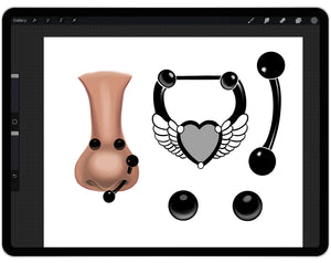 These Procreate piercing brushes are perfect for character design, tattoo flash, and fashion illustration. Quickly add earrings, nose rings, and other piercings to your digital portraits and concept art.