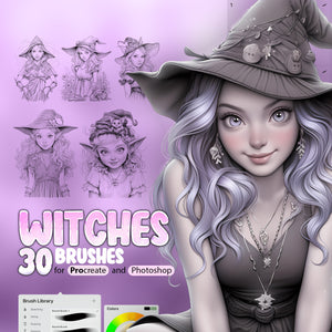 These Procreate witch brushes are perfect for fantasy art, Halloween projects, and character design. With detailed stamps of witches and magical elements, you can easily create enchanting illustrations for digital painting, concept art, and storytelling.