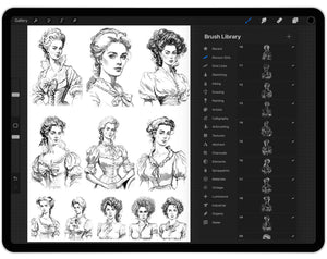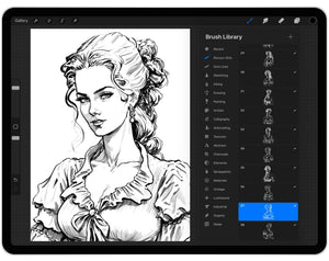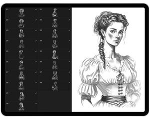 These Procreate Rococo brushes are perfect for vintage fashion design, historical illustrations, and decorative art. With detailed stamps of women in ornate costumes, you can easily create authentic 18th-century European scenes or stylized fantasy designs. Ideal for digital painting, concept art, and storytelling projects.