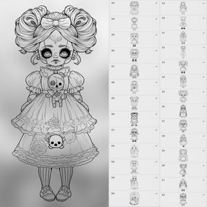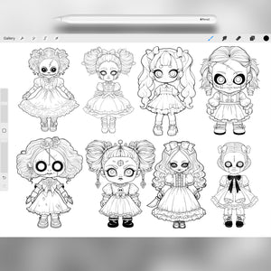This Procreate stamp set is the ultimate tool for anyone who wants to design creepy-cute characters, create Halloween art, or add stylized horror-inspired dolls to their digital illustrations.