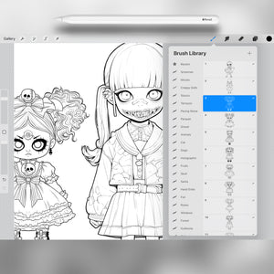 These Procreate chibi horror brushes are perfect for horror illustration, Halloween art, and creepy-cute character design. With ready-to-use Procreate chibi horror doll stamps, you can instantly craft expressive chibi doll faces, build themed sticker packs, or create atmospheric scenes featuring Procreate horror doll brushes. Whether you’re working on horror comics, character sheets, digital posters, or personal projects, these brushes help you work faster, stay creative, and deliver irresistibly eerie artwork.
