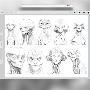 This Procreate stamp set is the ultimate tool for anyone who wants to create extraterrestrial illustrations, design humanoid characters, or quickly add reptilian alien beings to their artwork.