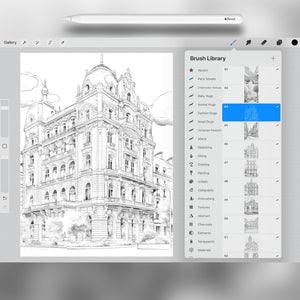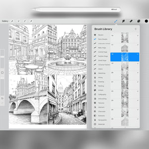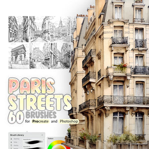 These Procreate Paris street brushes are perfect for architectural sketches, travel art, and storytelling. With detailed stamps of streets and buildings, you can easily create elegant Parisian-inspired compositions for digital painting, concept art, and design projects.